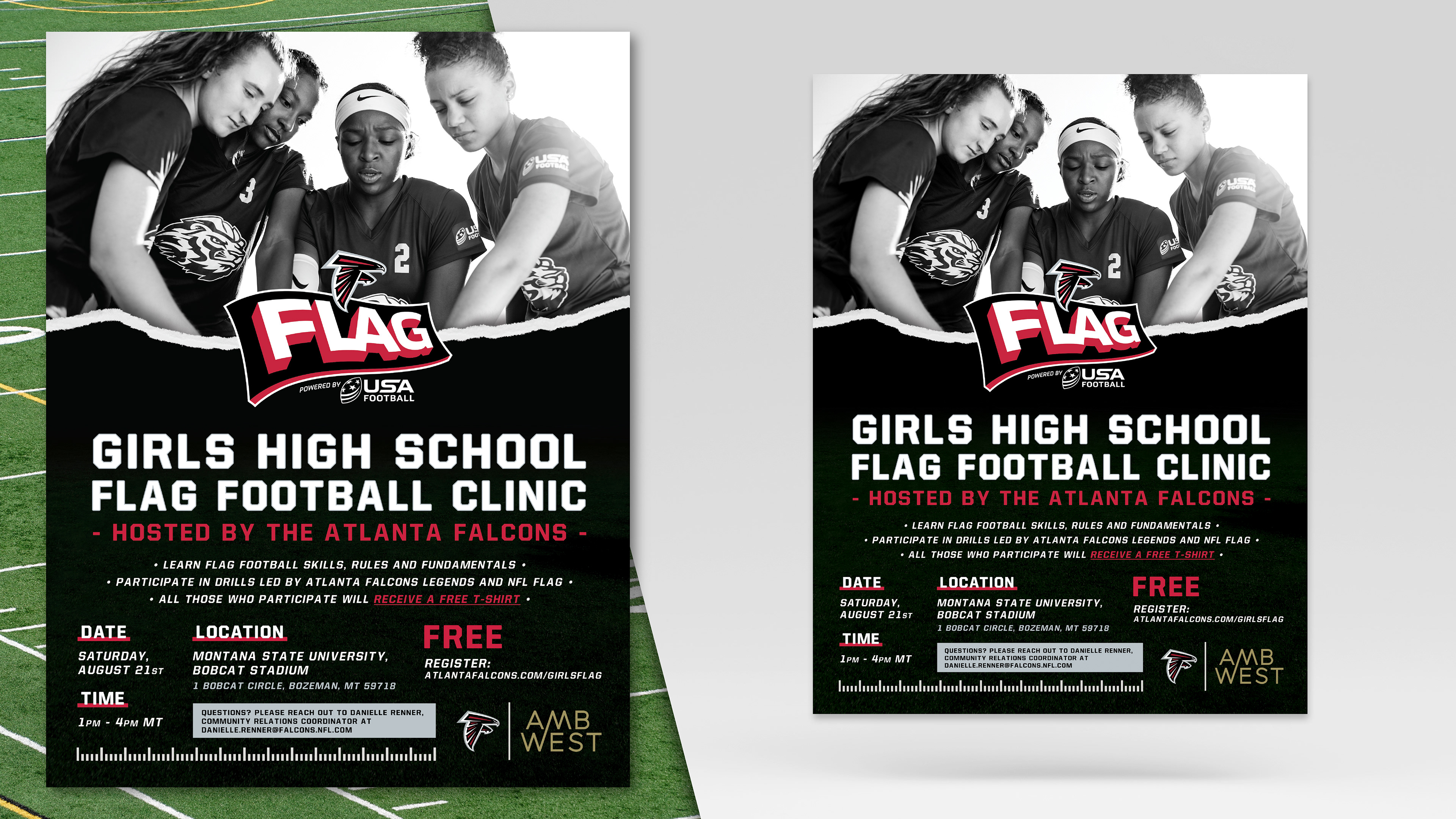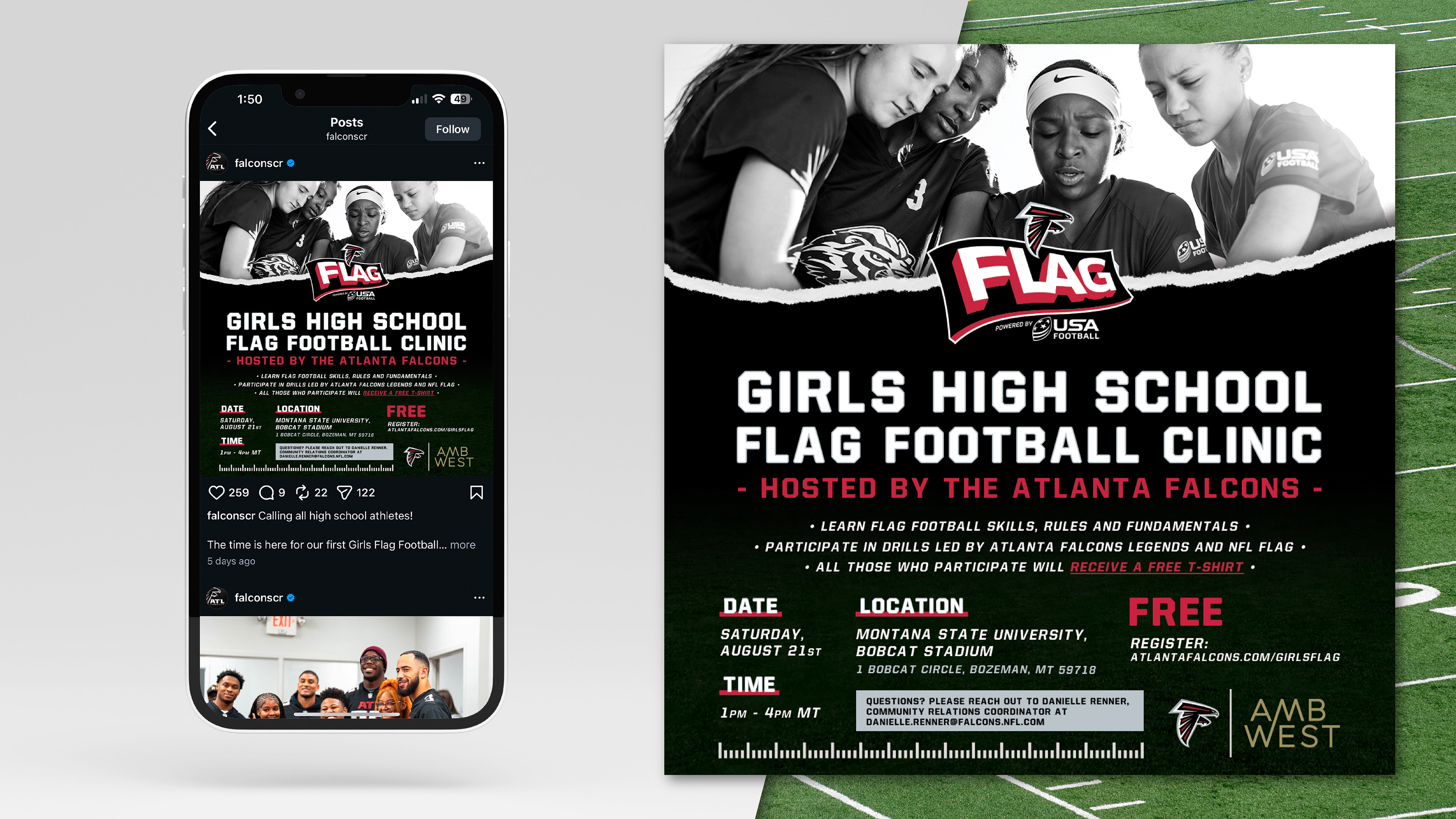Created as a design challenge during an interview process with the Atlanta Falcons, this project involved developing a cohesive visual identity for a community outreach event. I was tasked with designing a promotional flyer and a social media post to drive registration for their Girls High School Flag Football Clinic. Working within the Falcons' established brand guidelines, I utilized official team logos and photography to create visuals tailored to grab attention and drive clinic registration.